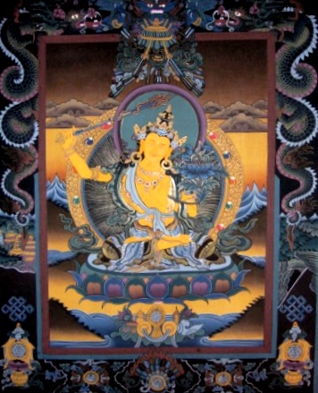 Seine rechte männliche Hand schwingt das Schwert der Weisheit, das die Unwissenheit zerstört und zugleich als Fackel dient, die Licht in die Dunkelheit bringt. Diese rechte Seite zeigt seinen kämpferischen Aspekt. Seine linke weibliche Seite symbolisiert seinen Weisheitsaspekt. Oft hält er in der linken Hand das Buch der Weisheit (prajnaparamita). Das Buch steht für die "Leerheit" (shunyata), welches der innersten Natur eines jeglichen Wesens entspricht. Erkennt der Mensch diese höchste Wahrheit, dass sein Wesen leer ist, wird seine essentielle Befreitheit, die immer da war,