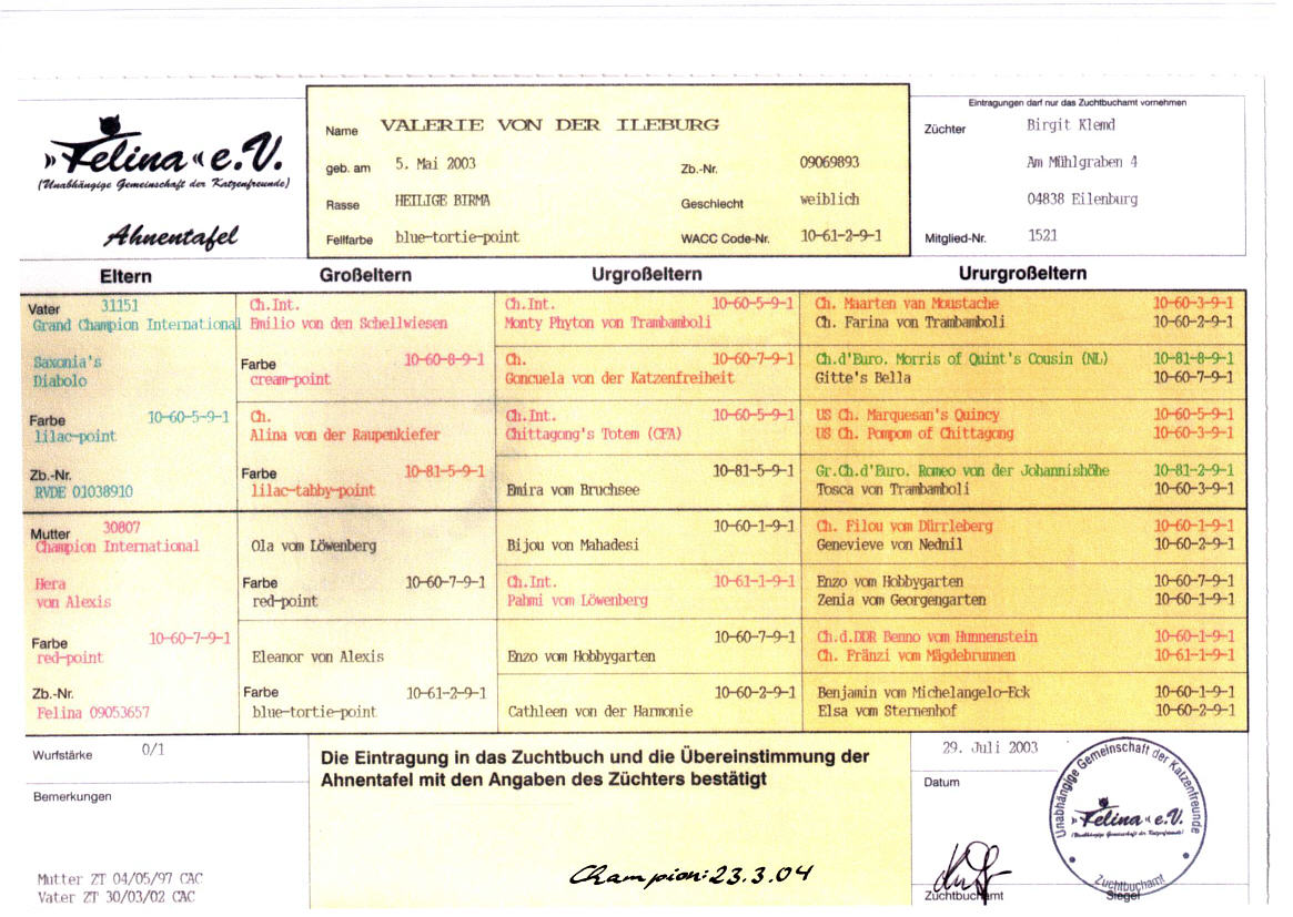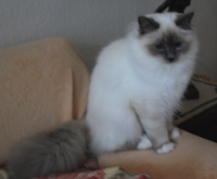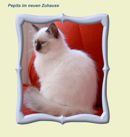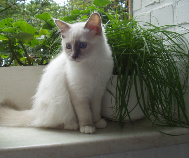 Auch für diese wunderschöne, liebevolle Katze möchte ich mich bei Birgit Klemd, Ileburg bei Leipzig, bedanken. Valerie entwickelt sich immer mehr zur ausgesprochenen Schmusekatze. Sie läßt keine Gelegenheit aus, mir ihre Zuneigung zu zeigen und regiert trotzdem mit ihrem ausdrucksvollen Blick die gesamte Mannschaft.Valerie lebt seit 31.10.08 mit ihrem Sohn Vishnu bei Birgit in Hamburg und alle sind wieder zufrieden und glücklich.